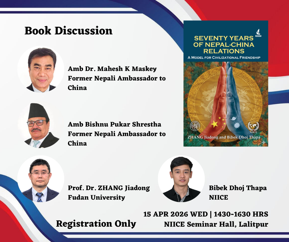 Search Recent Posts UK Hosting Talks on the Strait of Hormuz (SOH) April 5, 2026 How Conflict in West Asia Shapes Climate and Energy System Across Asia April 4, 2026 Not One Inch: Continuity from Mao Zedong to Xi Jinping in China’s Maritime Manifest Destiny April 2, 2026 Navigating SAARC Under Troubled Waters April 1, 2026 North or South: How Competing Railway Projects Will Shape Nepal’s Mineral Trade March 31, 2026 Recent Comments Date 15 Apr 2026 Time 2:30 pm - 4:30 pm Book Discussion: Seventy Years of Nepal China Relations Share this event + Add to Google Calendar + iCal / Outlook export