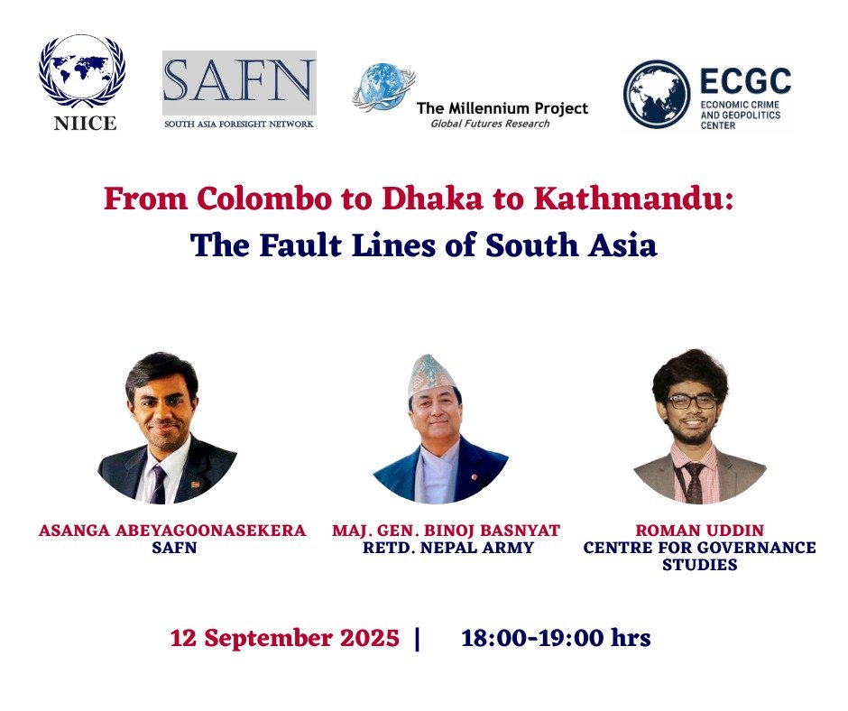 The Nepal Institute for International Cooperation and Engagement (NIICE) convened an online session on “From Colombo to Dhaka to Kathmandu: The Fault Lines of South Asia” on 12 September 2025. The discussion brought together three eminent speakers: Mr. Asanga Abeyagoonasekera (SAFN), Maj. Gen. Binoj Basnyat (Retd., Nepal Army) and Mr. Roman Uddin (Centre for Governance Studies, Bangladesh) to deliberate on the ongoing political transformations, youth-led protests, and governance challenges across Nepal, Sri Lanka, and Bangladesh.
