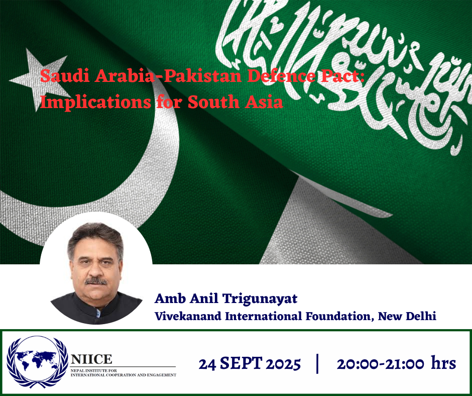 Search Recent Posts Seventy Years of Nepal-China Relations: A Model for Civilizational Friendship December 24, 2025 Understanding the International North-South Transport Corridor in the Wake of US Tariffs December 17, 2025 Nepal’s Potential in Global Climate Governance December 16, 2025 The Triangle of Terrorism in Afghanistan: Taliban, AQ and IS-K One Objective with Different Approaches December 15, 2025 Bangladesh Election 2026: High Stakes, Rising Unrest and Fragile Hope December 14, 2025 Recent Comments Date 24 Sep 2025 Expired! Time 8:00 pm - 9:00 pm Saudi Arabia-Pakistan Defence Pact: Implications for South Asia Share this event + Add to Google Calendar + iCal / Outlook export