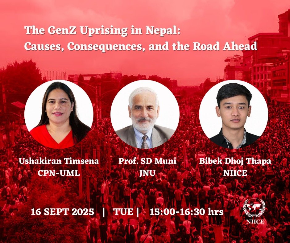 On 16 September 2025, a webinar was convened by Nepal Institute for International Cooperation and Engagement (NIICE), a dialogue series, focused on the Genz uprising, causes, consequences, and the future, featuring three distinguished speakers: Prof. S.D. Muni, Professor Emeritus at Jawaharlal Nehru University and a leading authority on South Asian politics; Usha Kiran Timilsina, a central committee member of the CPN-UML and a rising political figure advocating for accountability and reform; and Bibek Dhoj Thapa, Program Coordinator and Research Associate at NIICE, whose research focuses on technology and international relations.